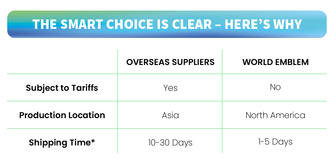 A trusted B2B patch supplier, World Emblem manufactures high-quality embroidered and custom patches in North America, with 6 strategic locations in the USA, Canada and Mexico. Unlike overseas suppliers, our products are not impacted by the recent tariffs on imports from China, Vietnam, and Cambodia. No matter what garment or hardgood you're decorating, we help you avoid delays, cut costs, and meet tight deadlines.