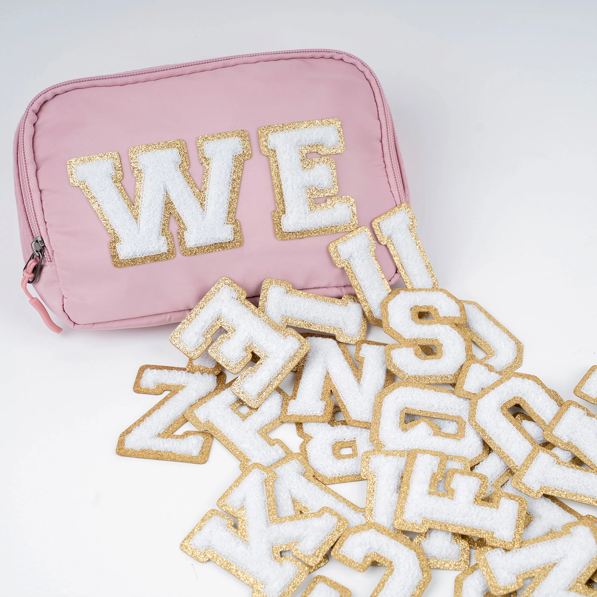 Crafted with white chenille thread on a gold glitter felt base, these letters and numbers offer a bold, timeless look—and are available with no minimum order quantity.