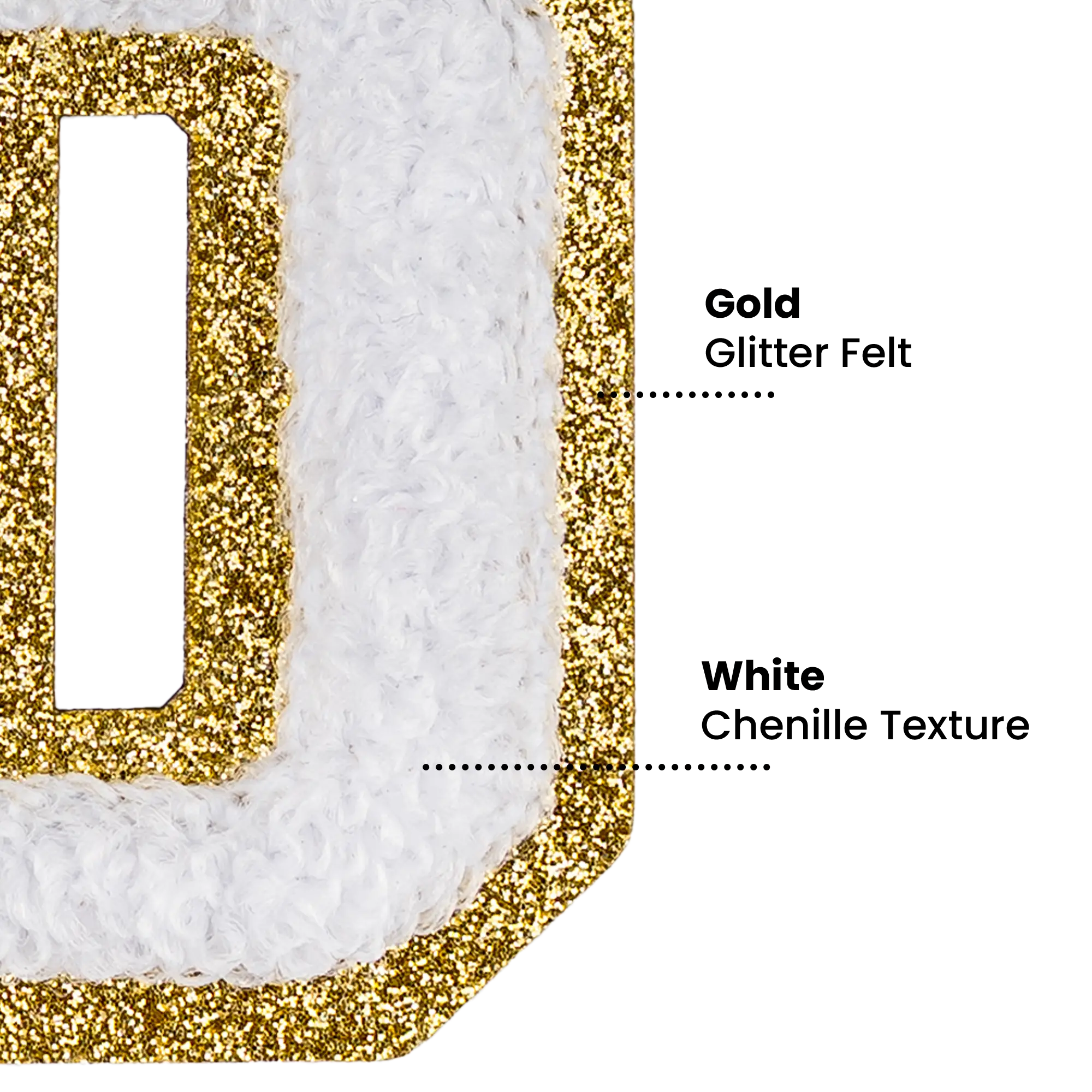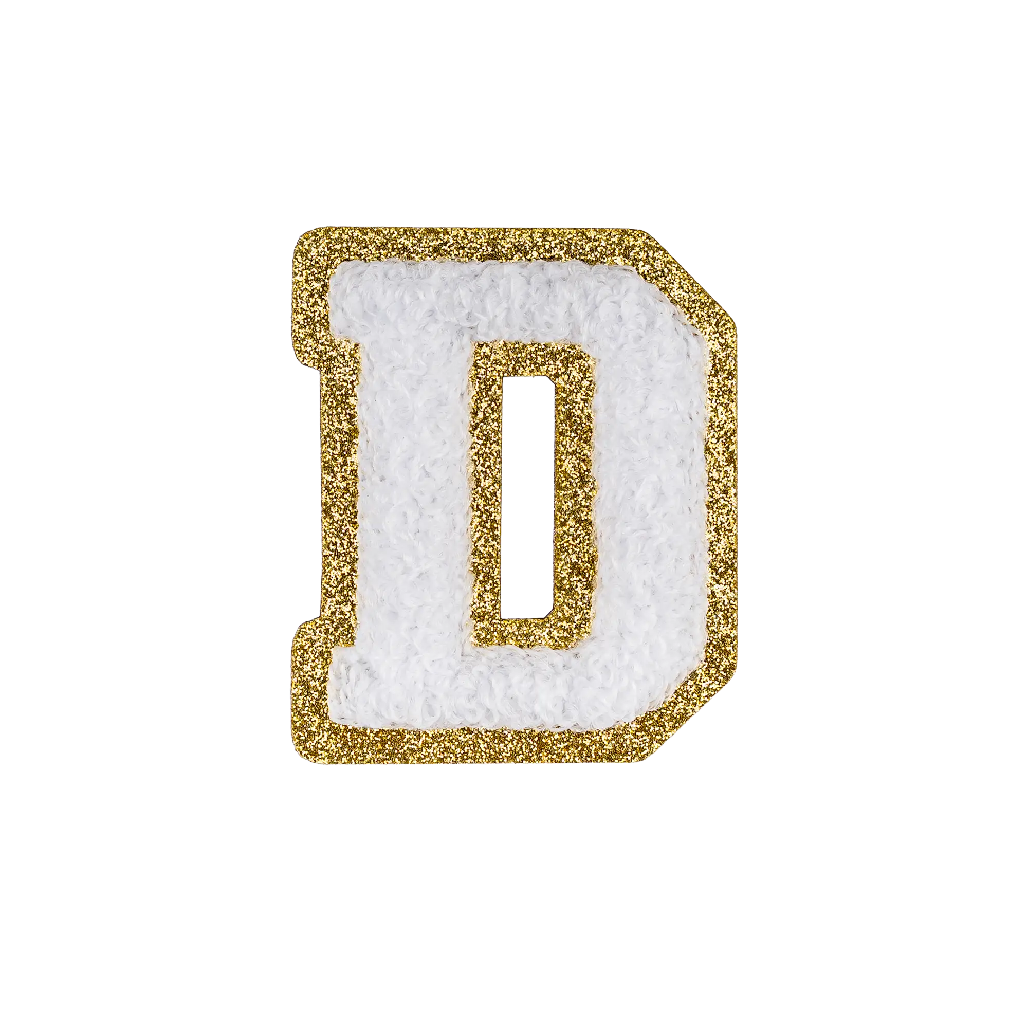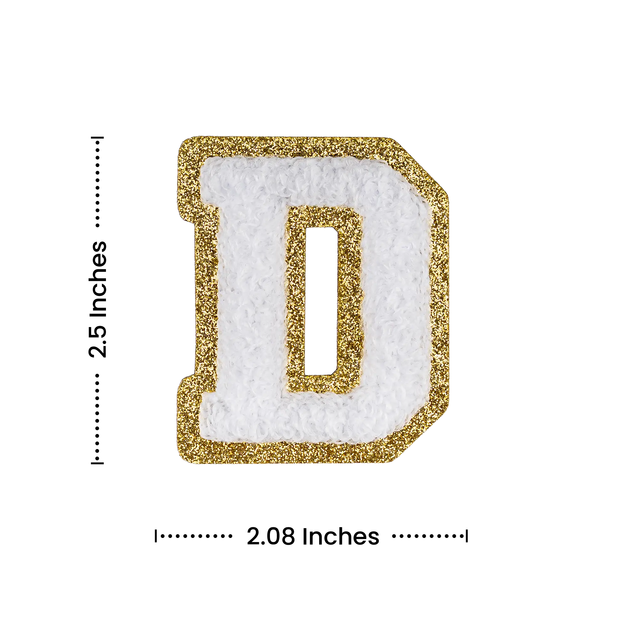 Pack of 25 - 2.5" - Chenille Letterman "D" Patch - White Chenille Thread/Gold Glitter Felt - Heat Applied Backing