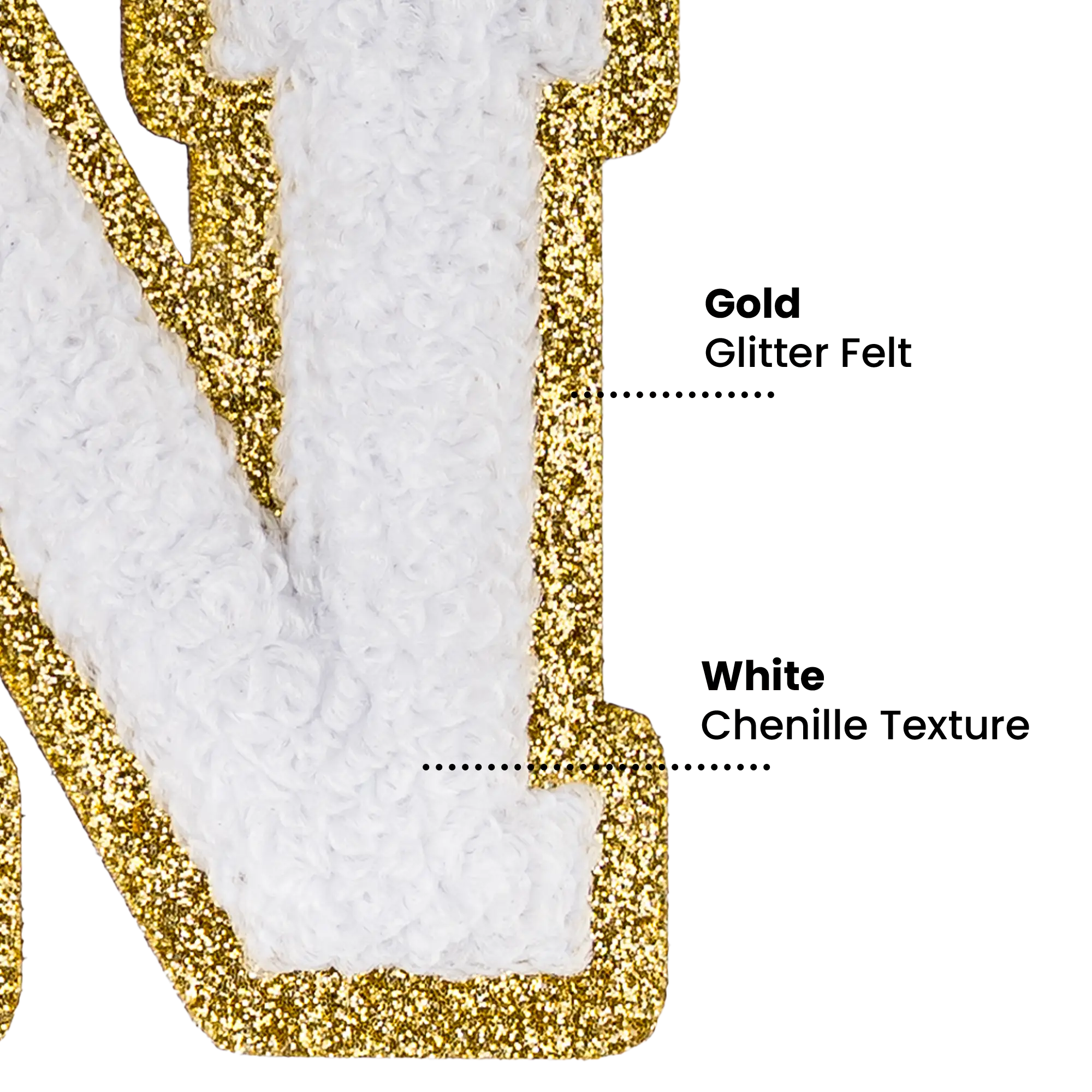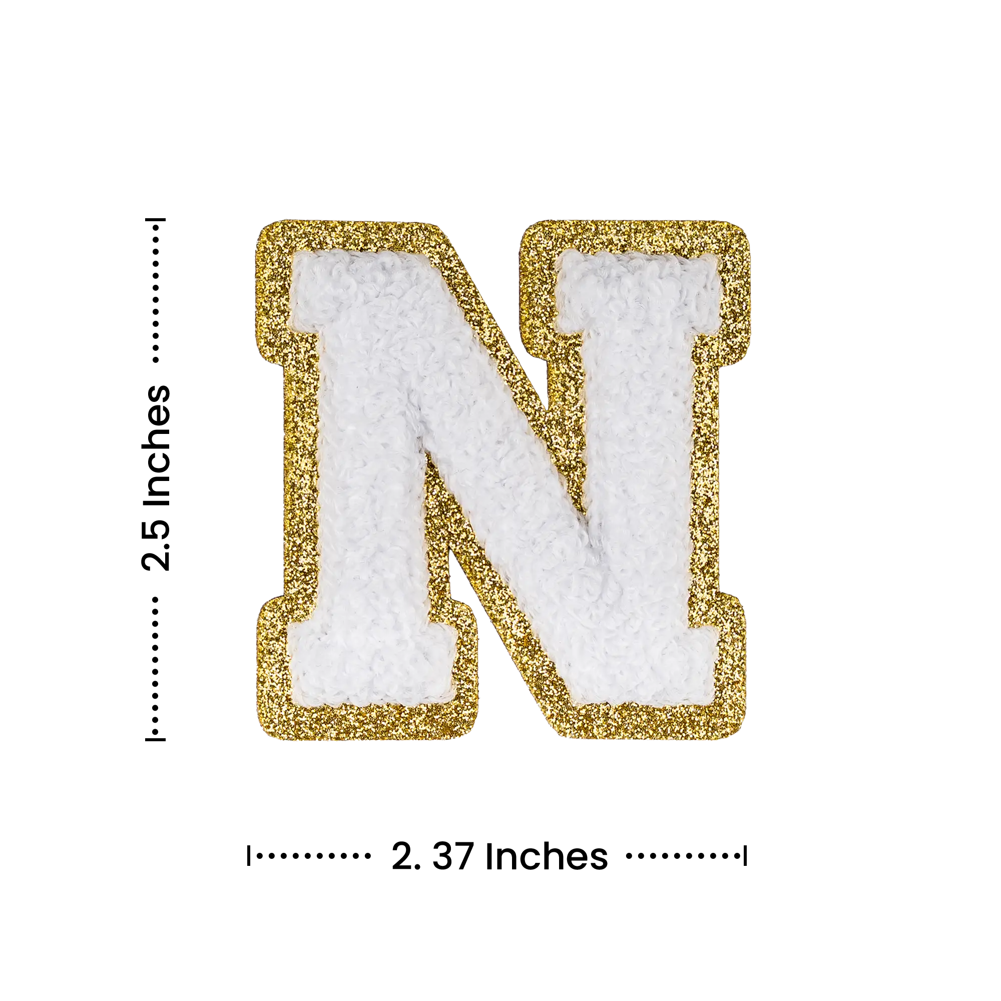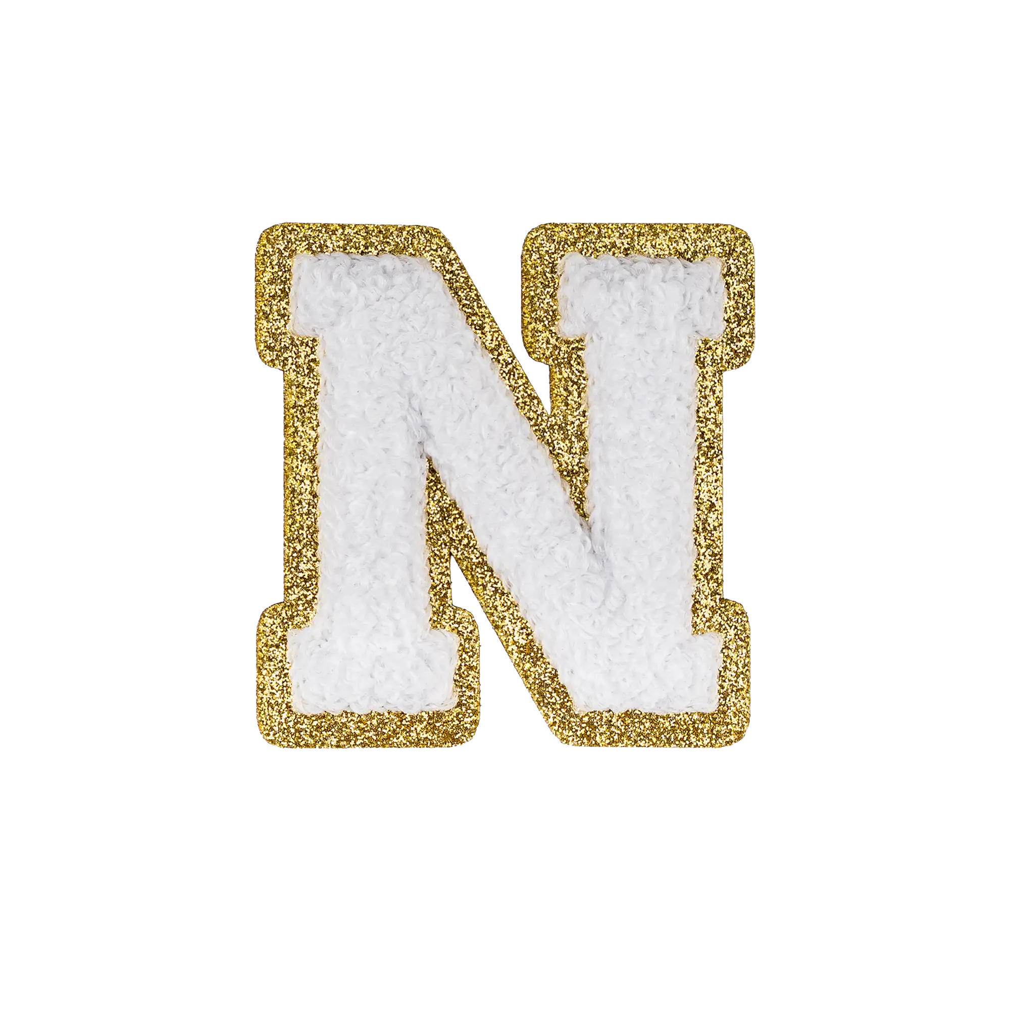 2.5" - Chenille Letterman "N" Patch - White Chenille Thread/Gold Glitter Felt - Peel & Stick Backing