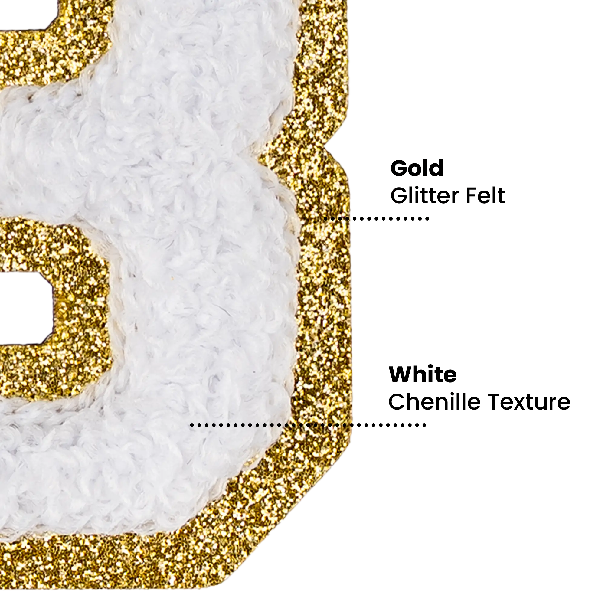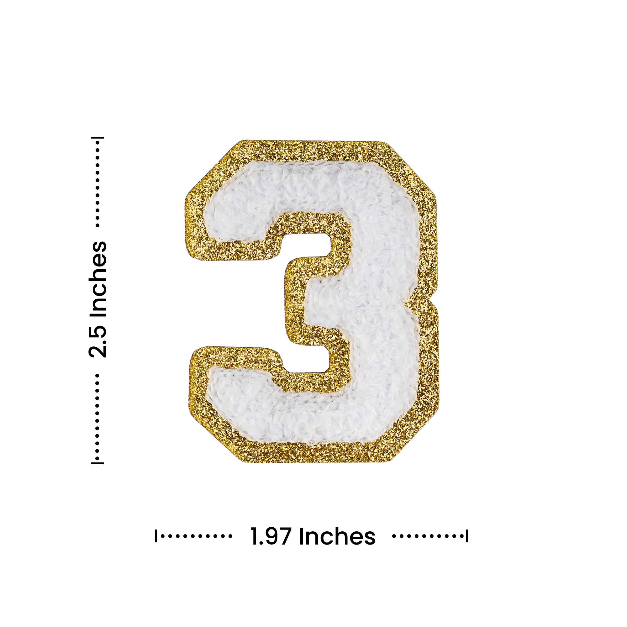 2.5" - Chenille Letterman "3" Patch - White Chenille Thread/Gold Glitter Felt - Heat Applied Backing