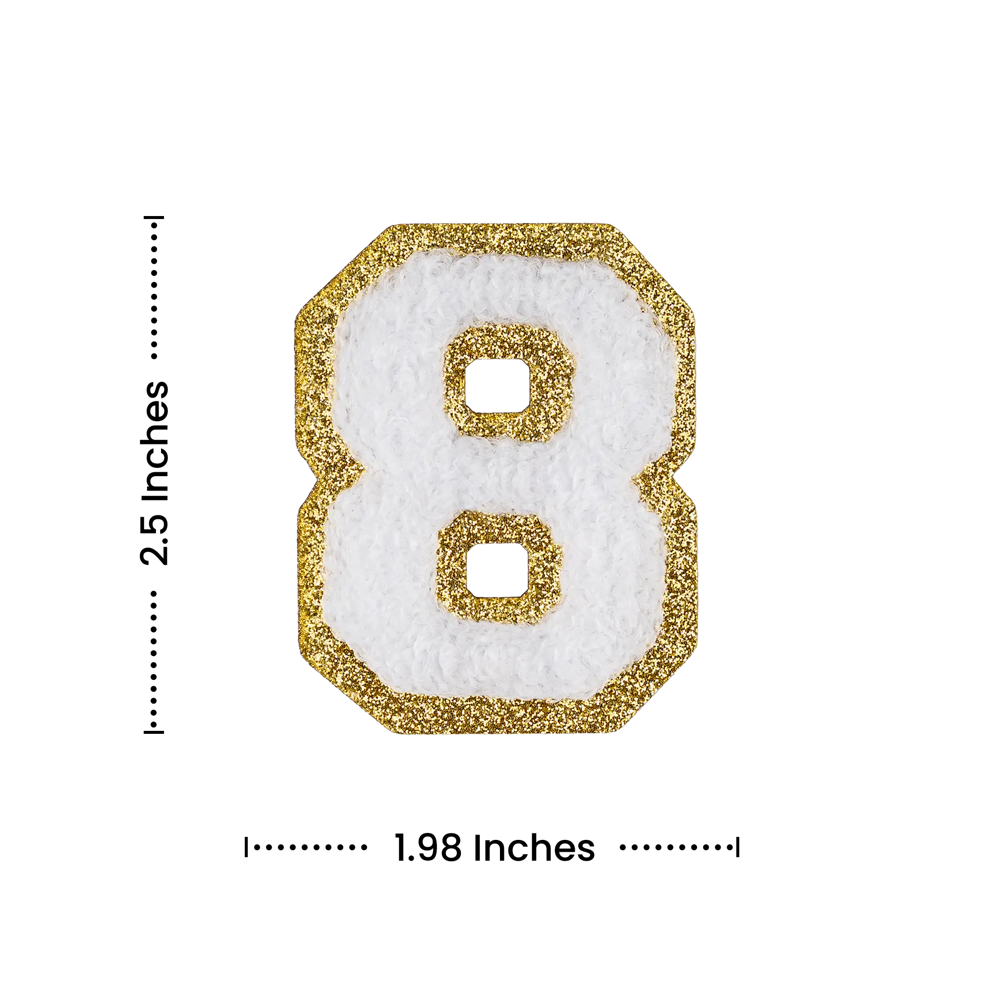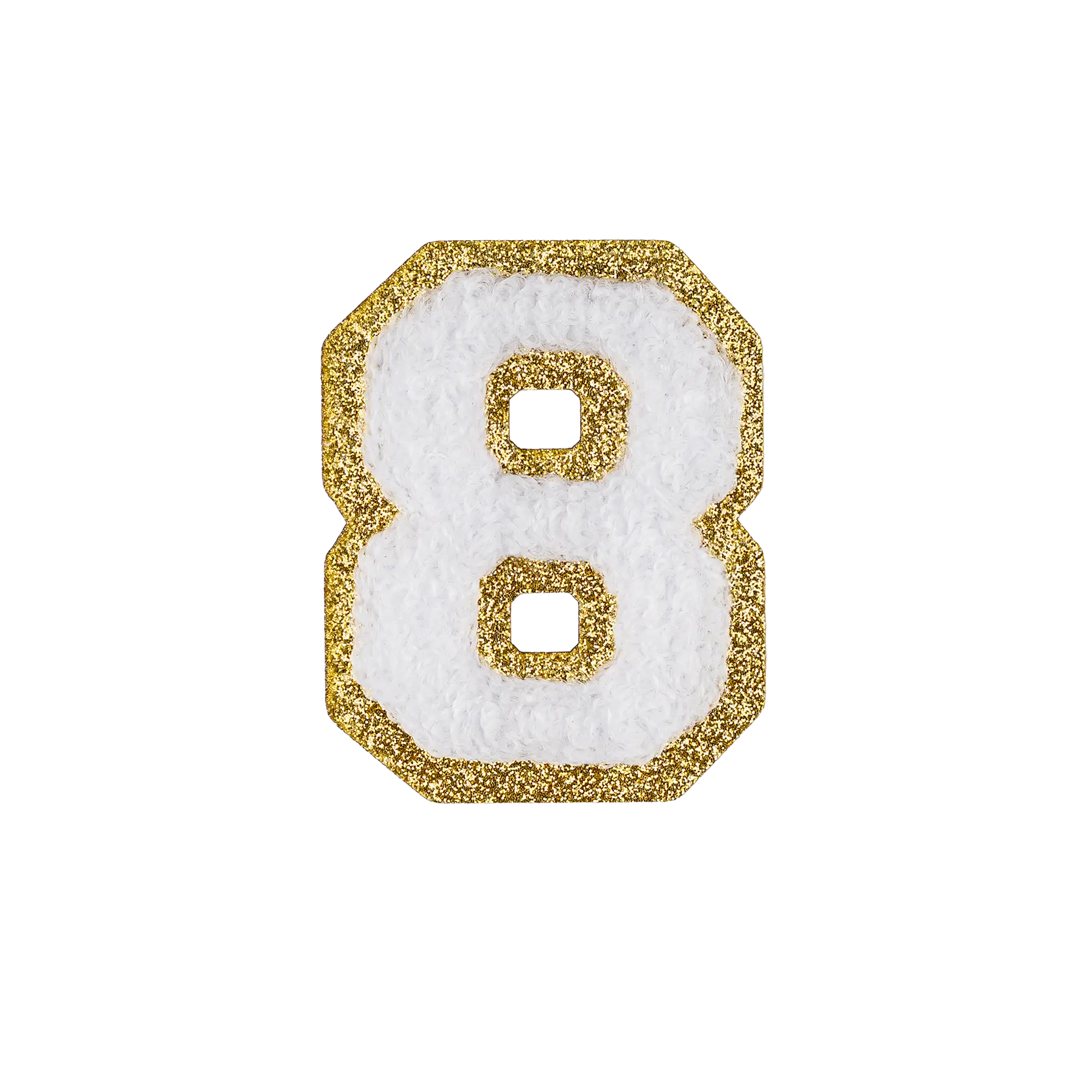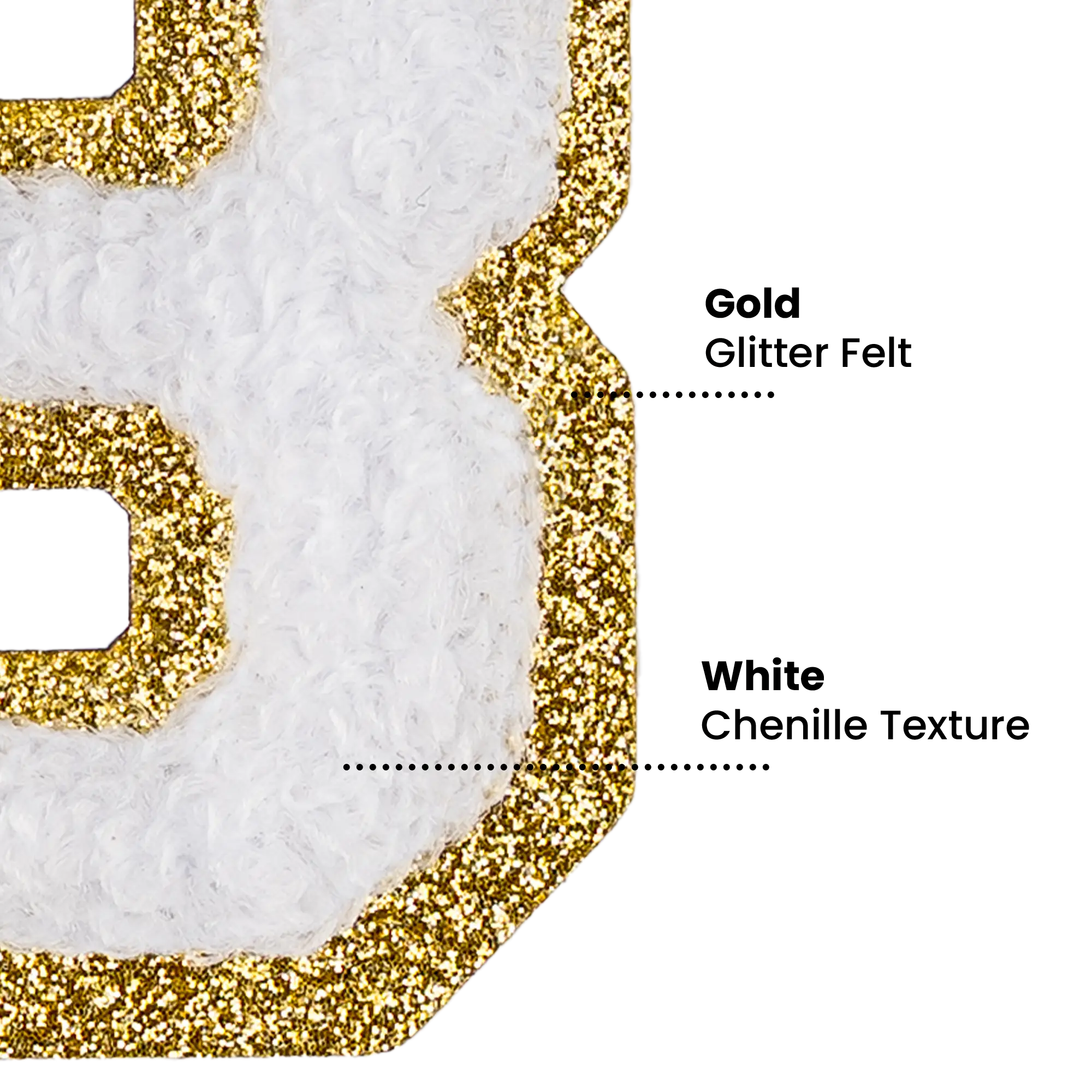 2.5" - Chenille Letterman "8" Patch - White Chenille Thread/Gold Glitter Felt - Heat Applied Backing