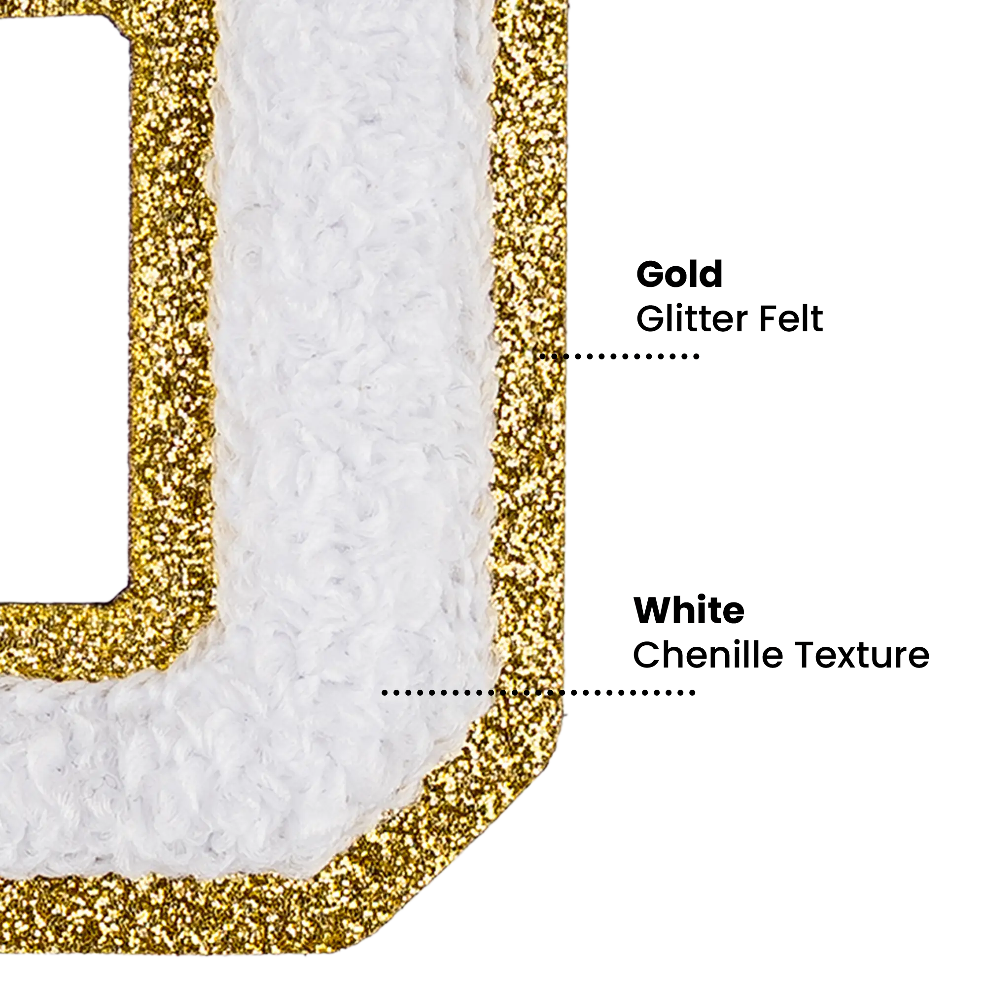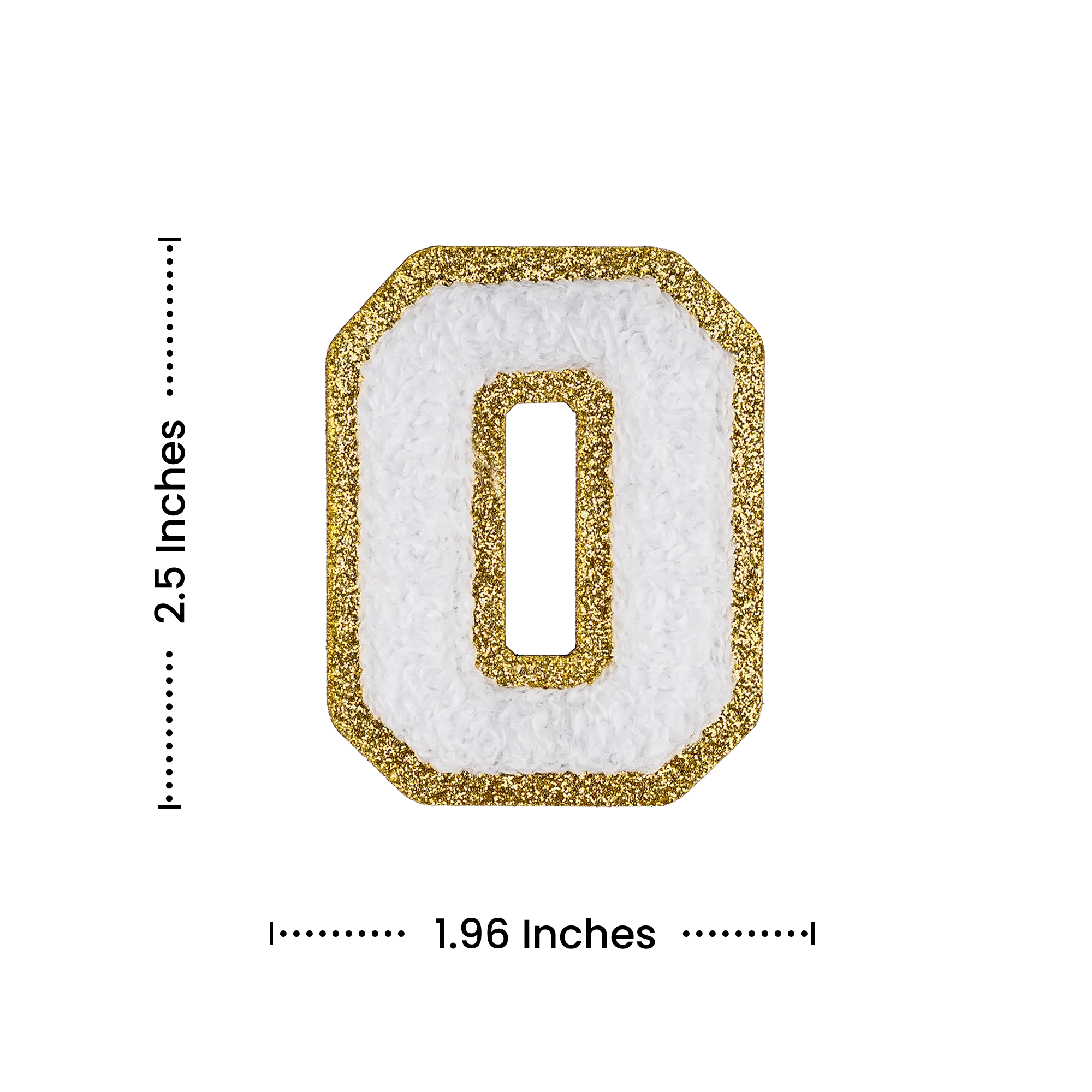 2.5" - Chenille Letterman "0" Patch - White Chenille Thread/Gold Glitter Felt - Peel & Stick Backing