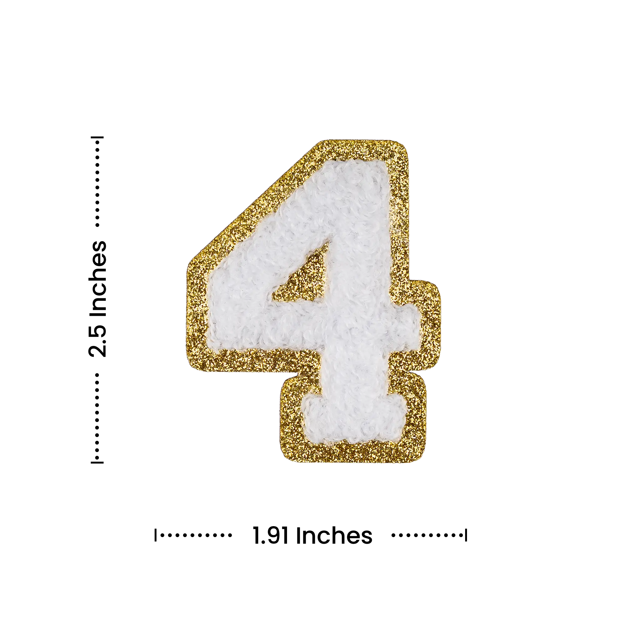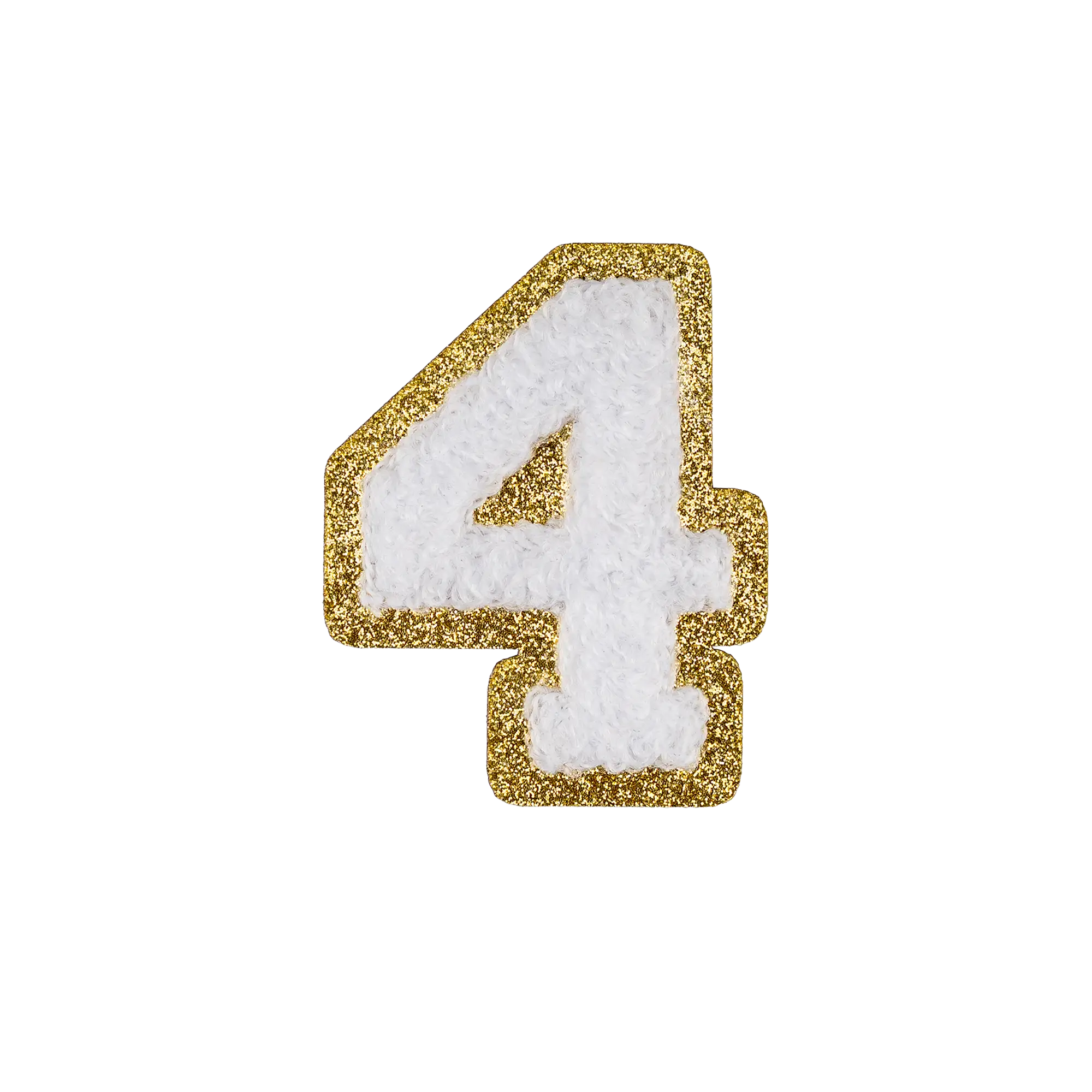 2.5" - Chenille Letterman "4" Patch - White Chenille Thread/Gold Glitter Felt - Peel & Stick Backing