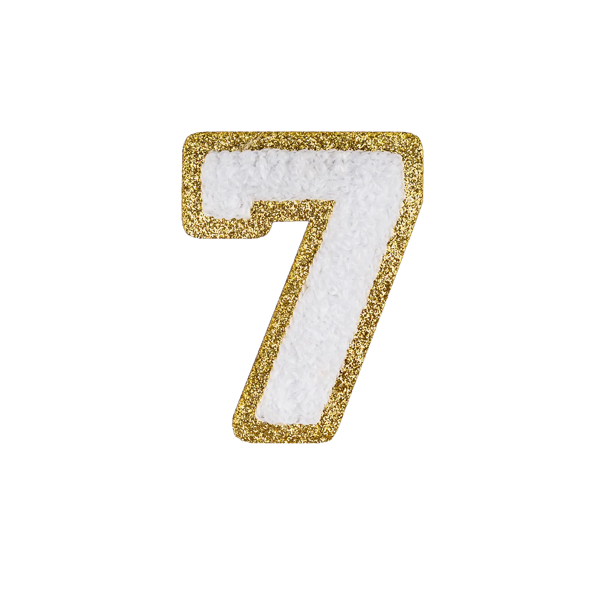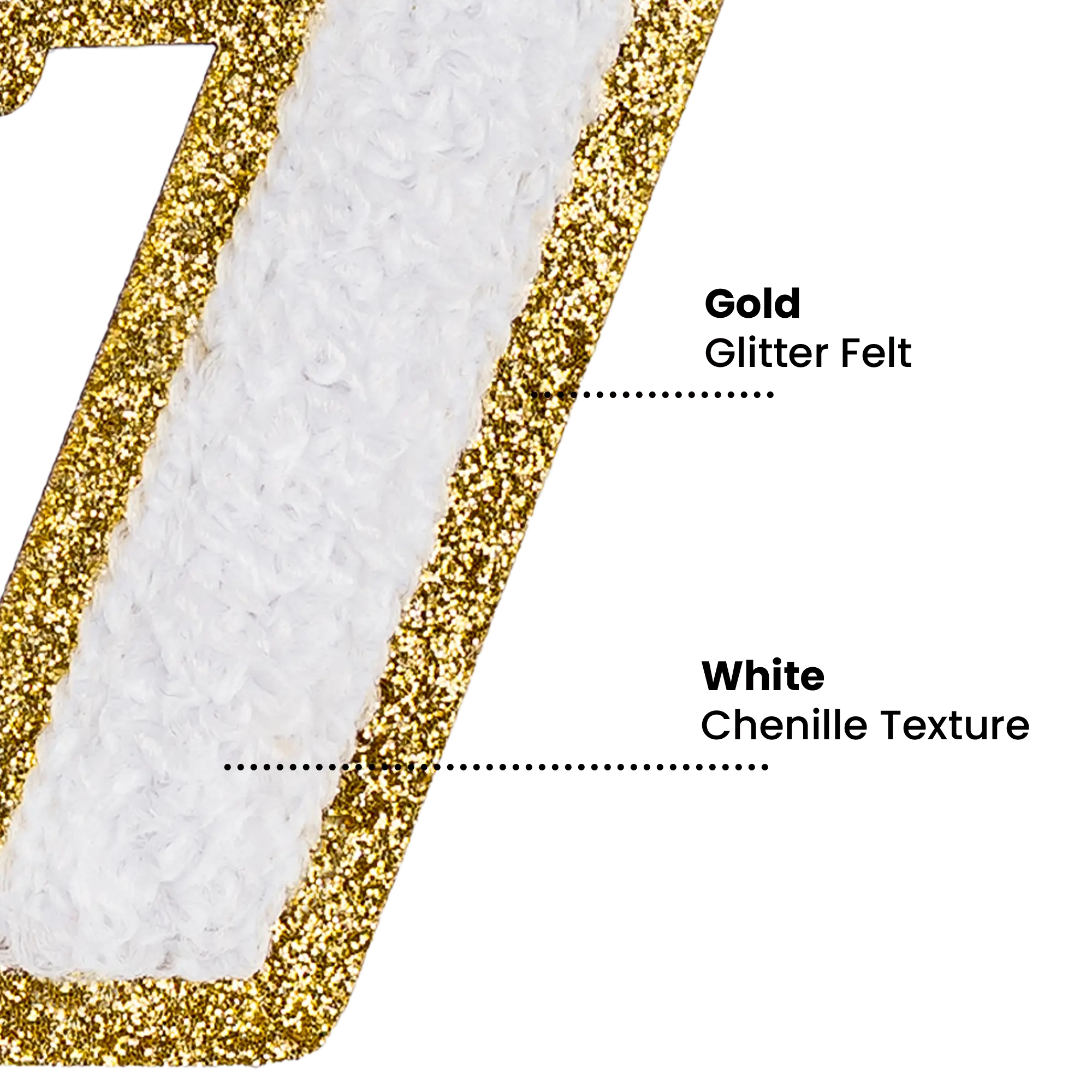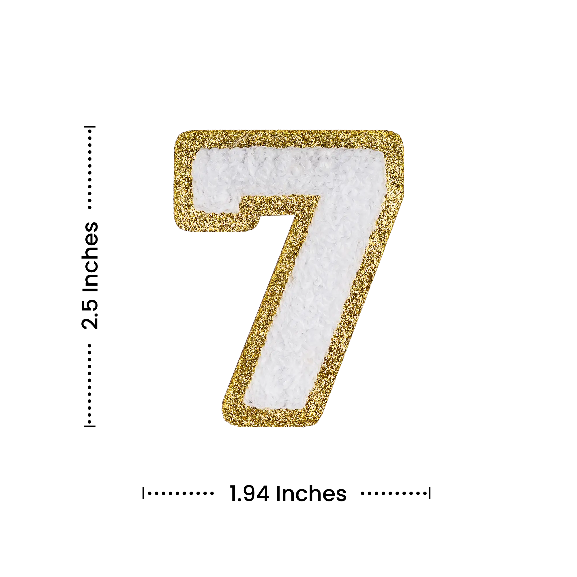 2.5" - Chenille Letterman "7" Patch - White Chenille Thread/Gold Glitter Felt - Peel & Stick Backing